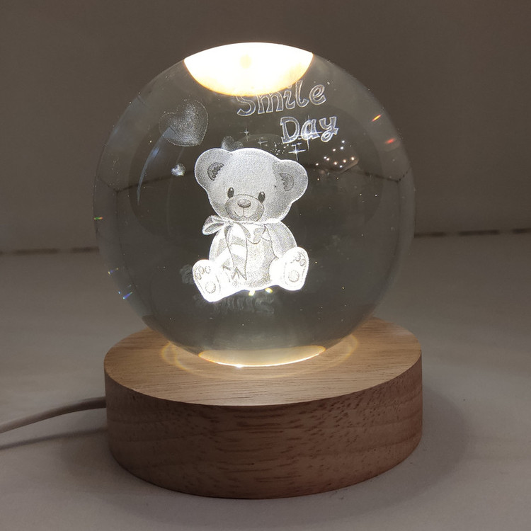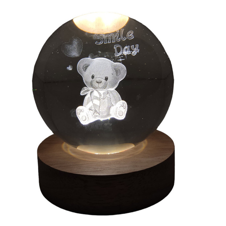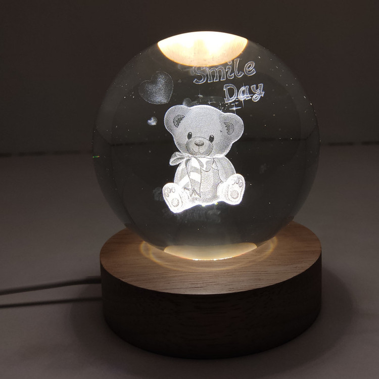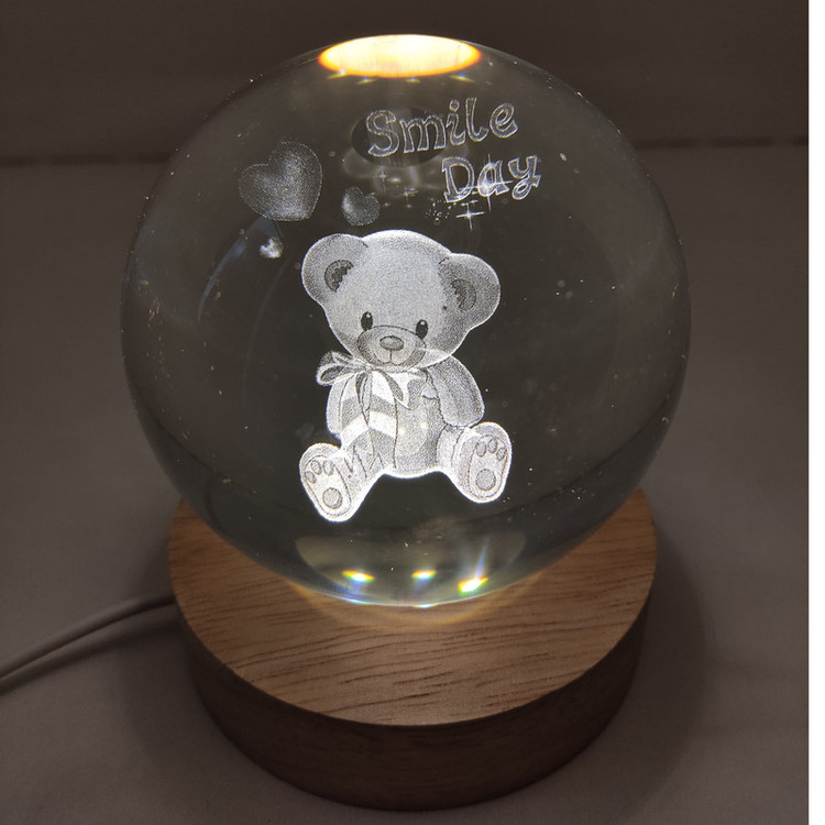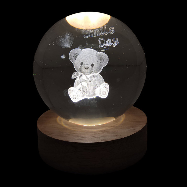 گوی کریستال سه بعدی مدل چراغ خواب طرح خرس یک دکوری کریستالی بسیار شفاف است که درون خود طرح خرس دارد که حتی بدون روشن شدن چراغ داخل پایه چوبی، طرح زیبای آن به خوبی قابل مشاهده است. با این وجود کابل درون پایه چوبی به برق متصل می شود و LED های موجود در داخل پایه روشن شده و طراحی زیبای داخل گوی را دو چندان می کند. زیبایی، ظرافت و طراحی بسیار خاص این نوع گوی، هر گروه سنی را مجذوب خود می کند و بی شک به عنوان دکور می تواند زیبایی چشم نوازی را به محیط مورد نظر شما از میز کار گرفته تا اتاق، کتابخانه یا هر جای دیگر ببخشد.